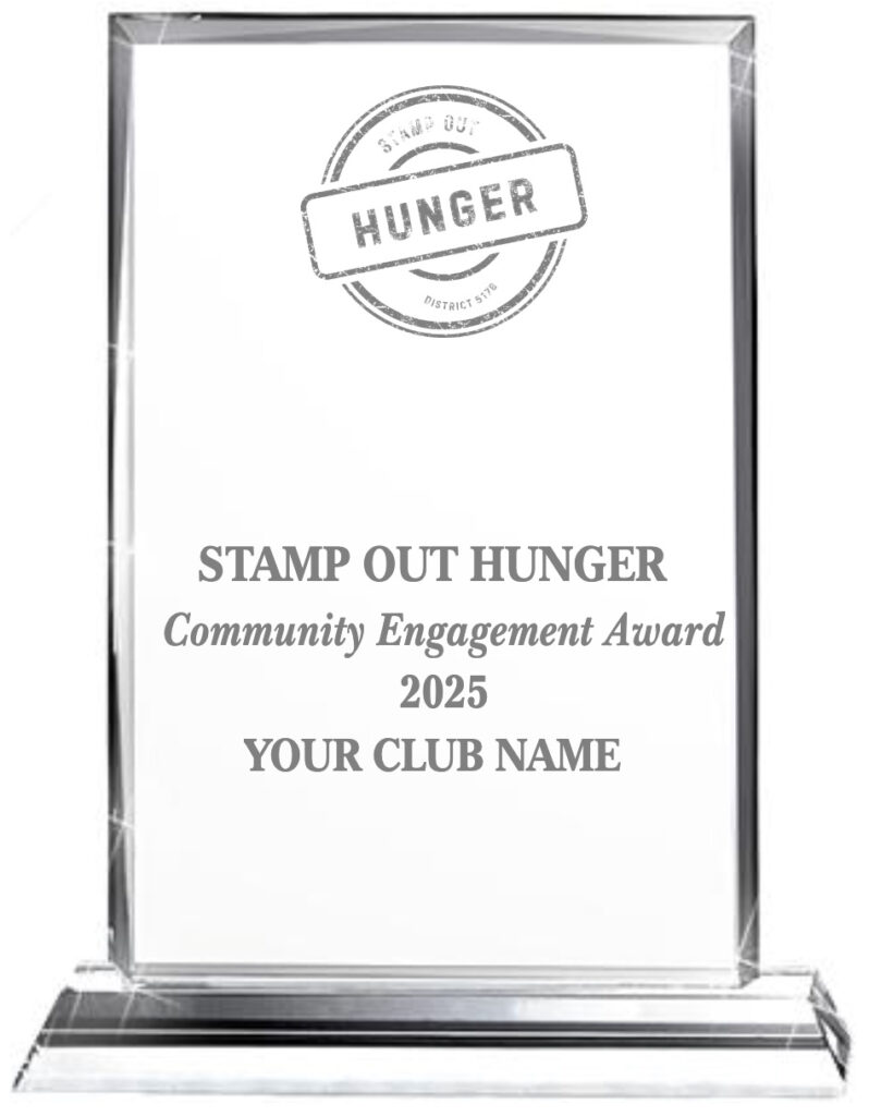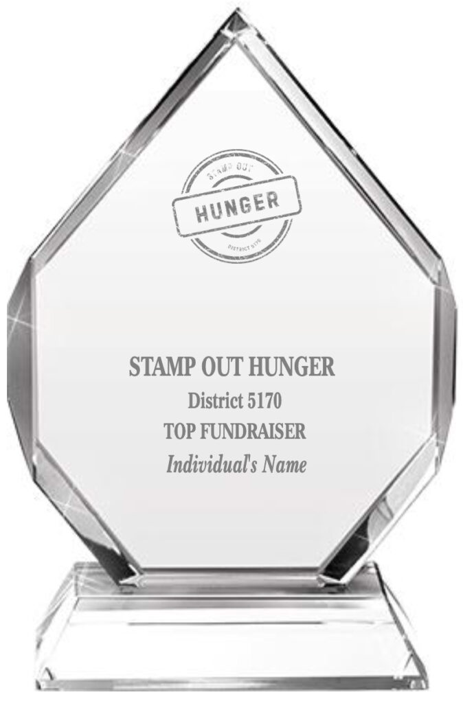 The STAMP OUT HUNGER competition awards beautifully crafted crystal-etched trophies to honor outstanding achievement in three categories: Most Raised by a Club Per Capita, Most Raised by an Individual, and Most Community Engagement by a Club, recognizing the club that inspires the most community members to join as teams or team members.